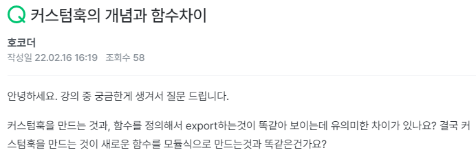 코딩앙마 | React JS #13 Custom Hooks - 초보자를 위한 리액트 강좌 별코딩 | React Hooks에 취한다 - Custom Hooks 커스텀 훅 | 리액트 훅스 시리즈 8dong.log | Custom Hooks 커스텀 훅이란? 중복된 코드를 줄이기 위함 custom hook은 내부에서 다른 react hook을 사용할 수 있음 (일반 함수는 불가) 내부에서 Hooks를 사용할 계획이 없다면(지금 또는 나중에) Hook으로 만들지 마세요. 커스텀 훅을 만든다 = 함수를 만든다 (함수이름에서 use를 붙이면 훅을 사용하면서 리액트에서 콘솔에 경고 메세지를 보내줌) 커스텀 훅을 만들면 내부의 로직을 상관하지 않고, 훅에 매개변수를 받아주고, 훅이 return 하는 값들만 꺼내서 쓸 수..
