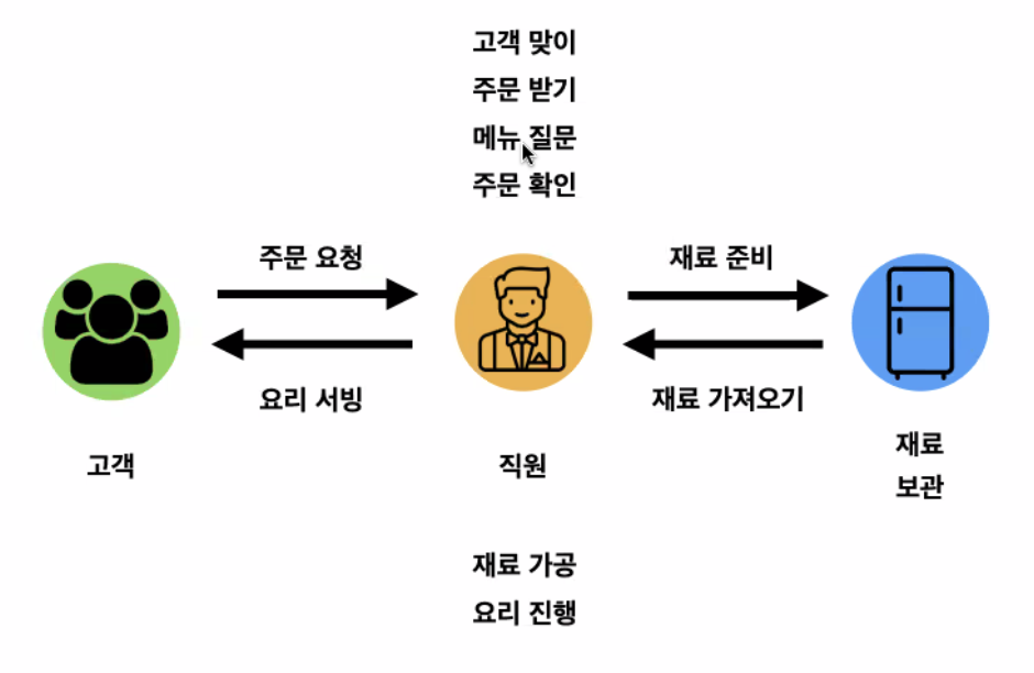 관심사의 분리 Seperation of concern(SoC) 코드에서 봐야할 부분, 보지 말아야할 부분을 구분할 수 있다 프론트: html, css, javascript: 구조, 디자인, 기능 을 각각 나눠보는 것 백앤드: 백앤드 자체가 기능이지만, 그 기능에서 또 관심사를 나눌 수 있음 서버: 데이터 가공 - 정보가 만들어짐 만들어진 형태를 json이라는 형태로 클라이언트에 보내줌 (텍스트일 수도 있고, 다른 형태 일 수 도 있음) 식당에서 고객, 요리사와 비슷함. 고객의 요청없이 요리를 하지는 않음 (요청-응답) 직원의 역할도, 나눌 수 있음 (관심사의 분리) 한 파일 -> 한 Layer (업무별로 나누어진): 각 역할이 명확, 독립적, 서로에게 끼치는 영향 최소화, 높은 가독성, 재사용성 MVC(..